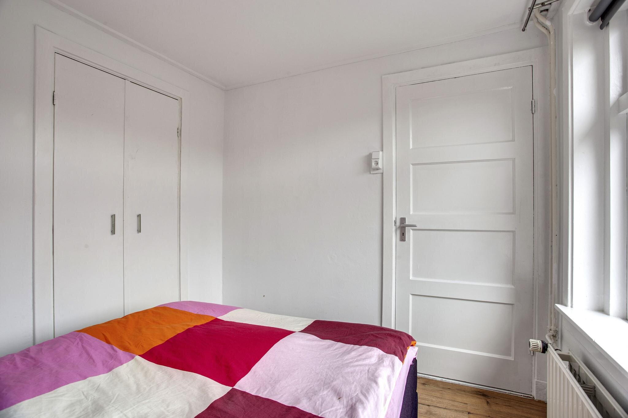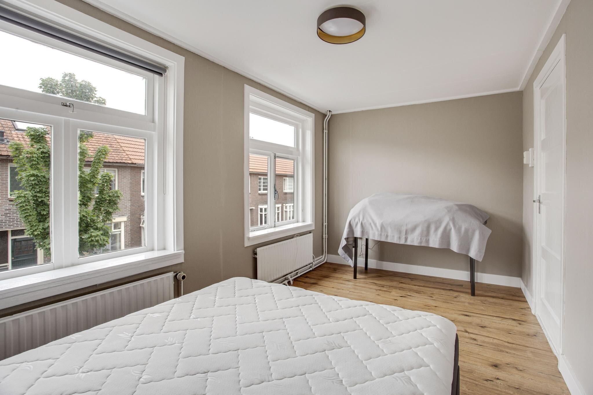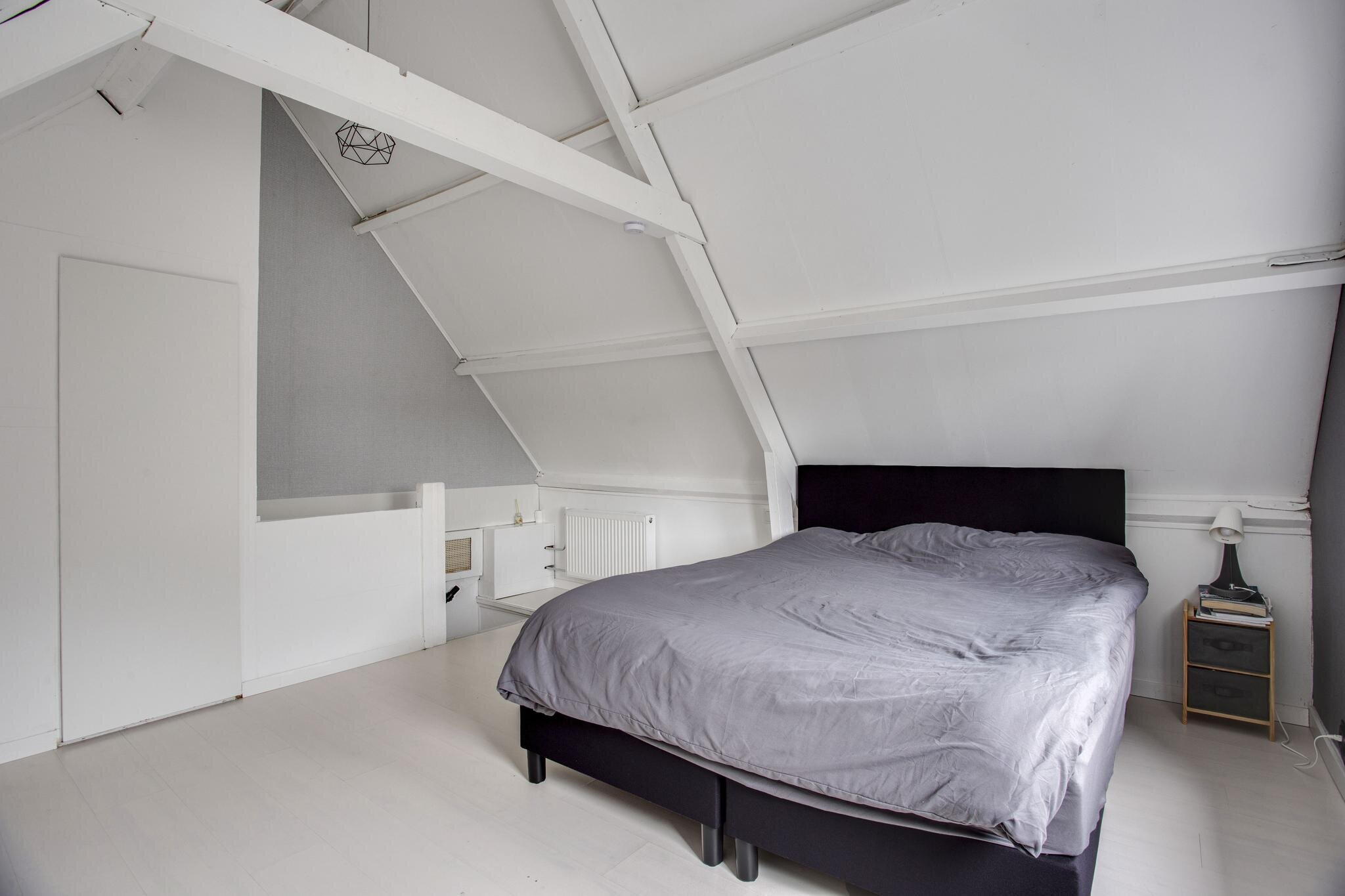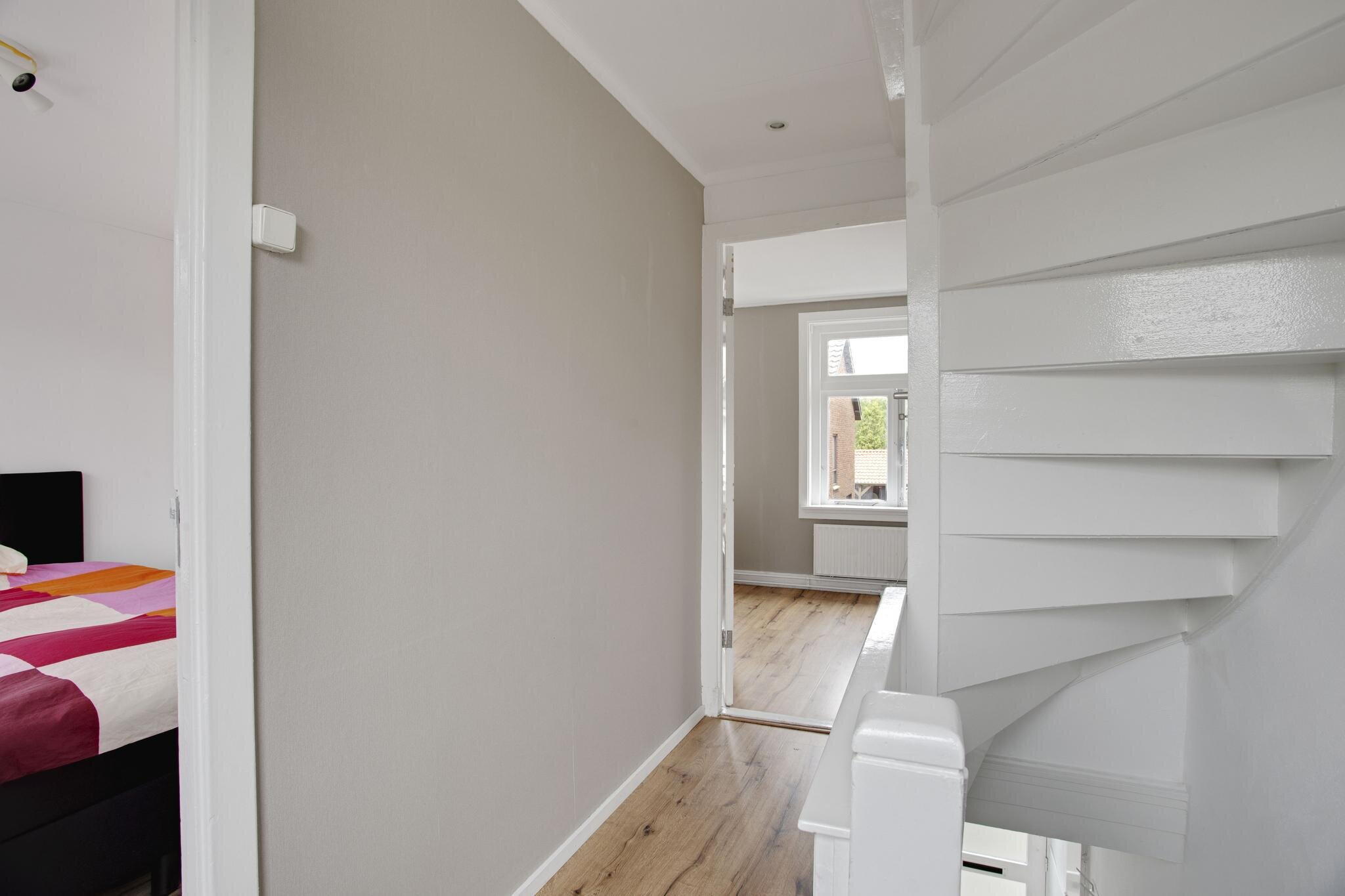 De overloop op de eerste verdieping biedt toegang tot twee slaapkamers, ontstaan door een praktische herindeling. Aan de voorzijde bevindt zich een ruime hoofdslaapkamer, aan de achterzijde een tweede, iets kleinere slaapkamer. Een vaste trap leidt naar de tweede verdieping.