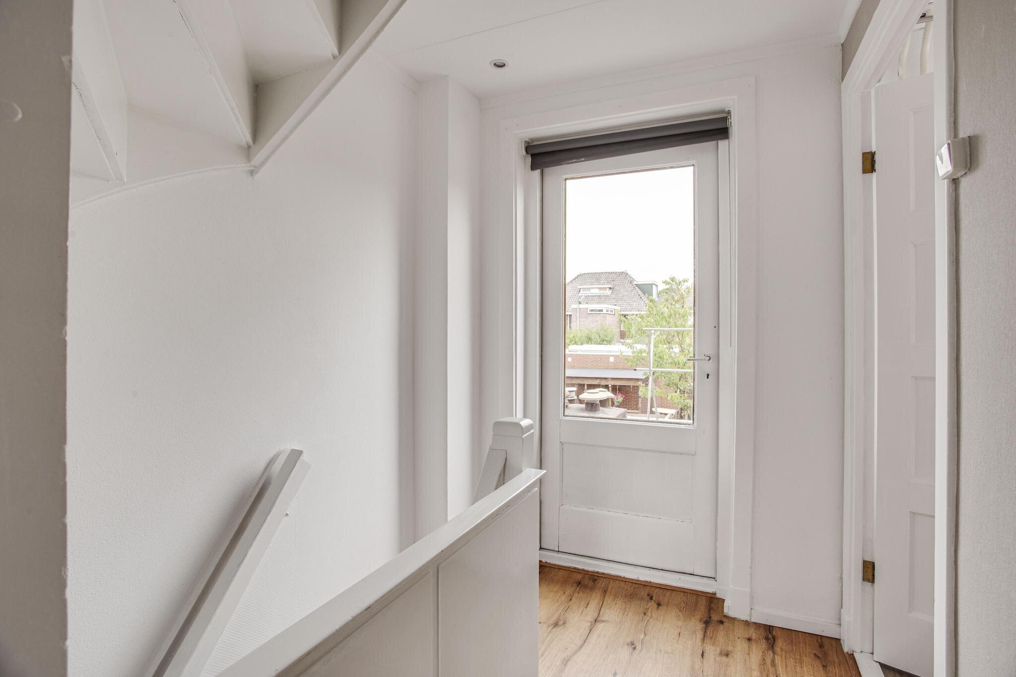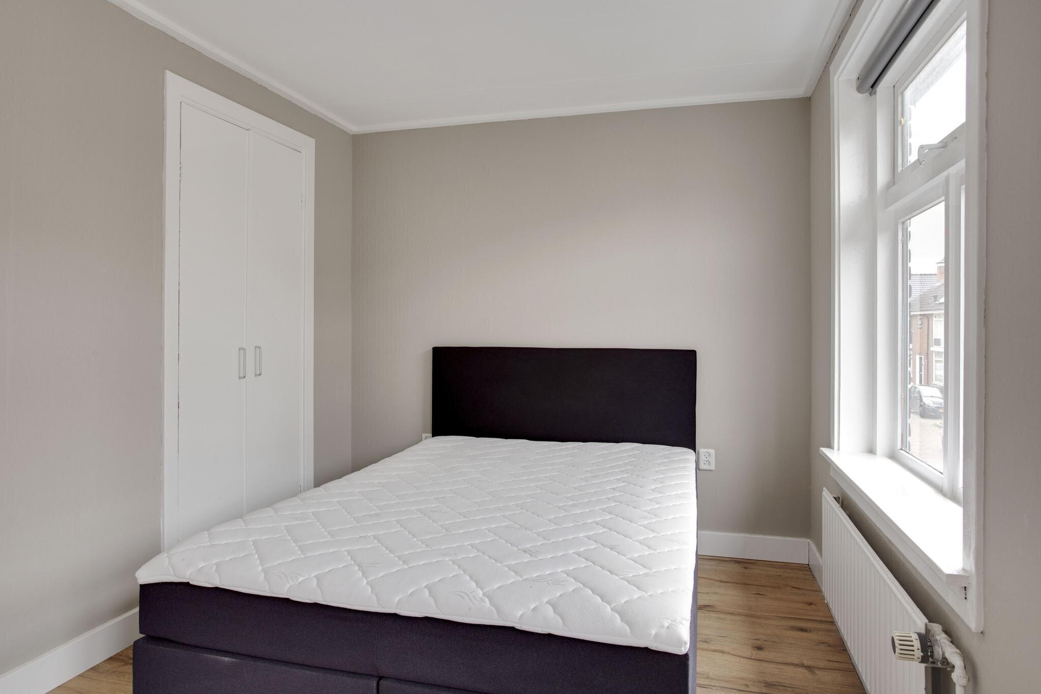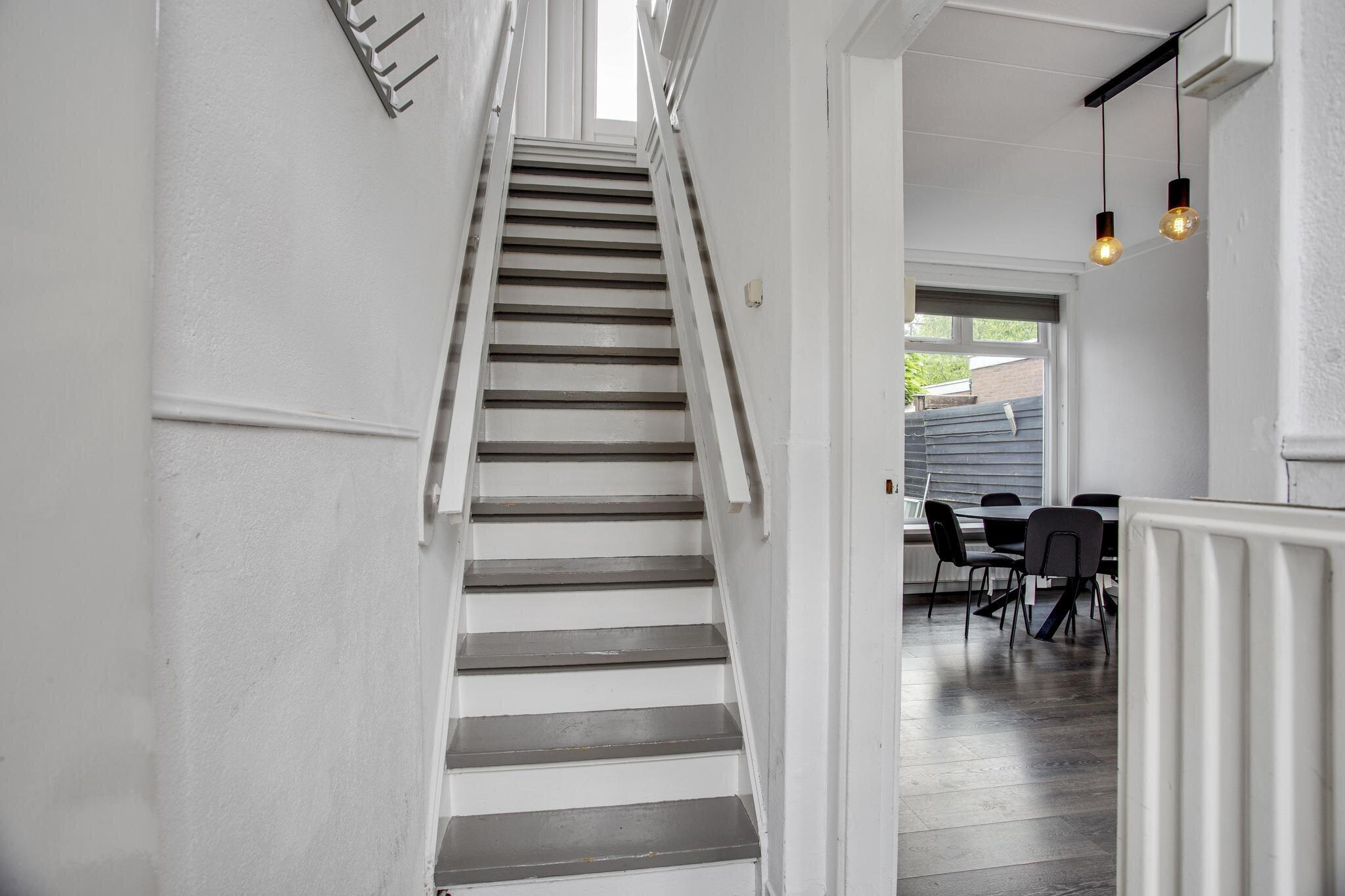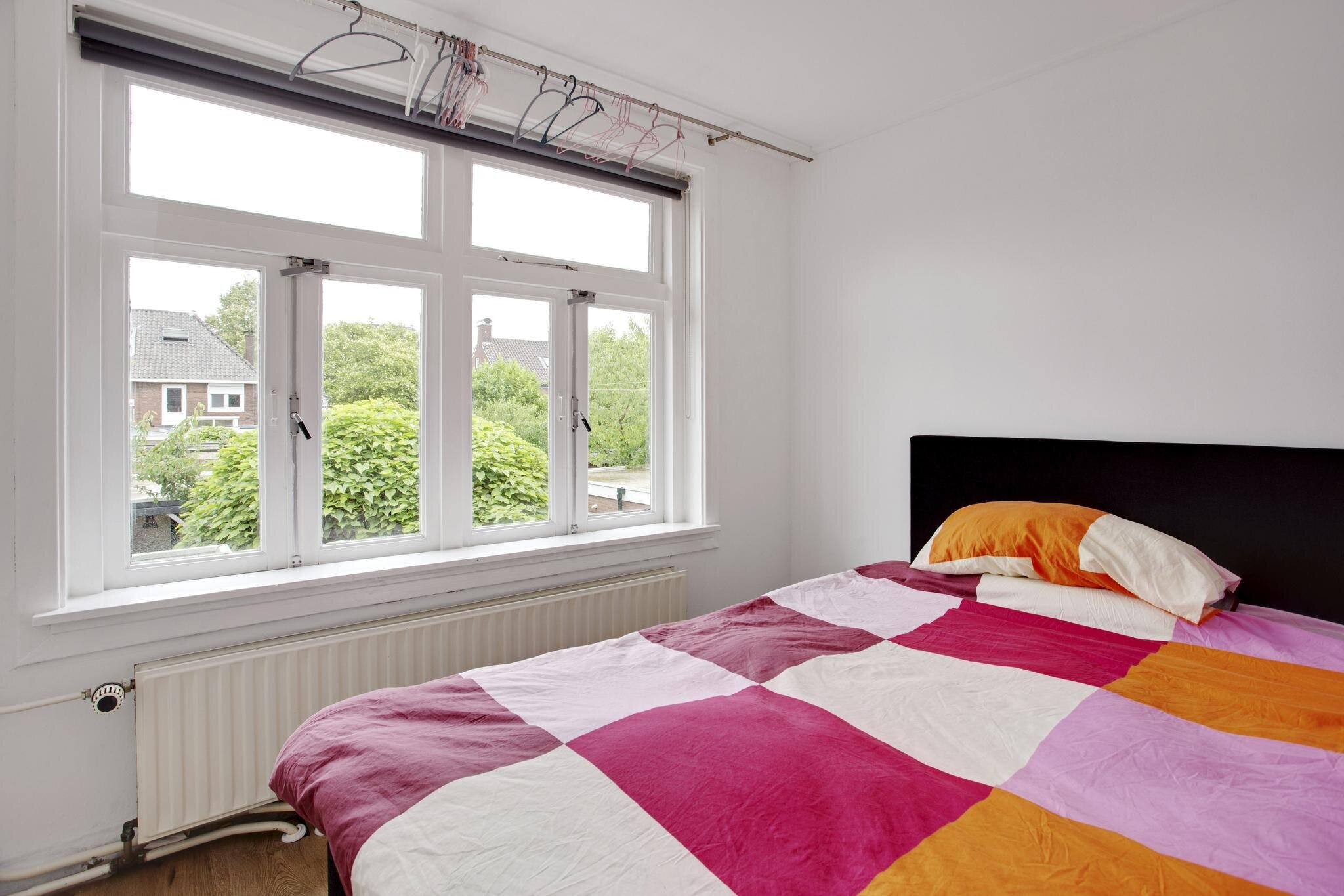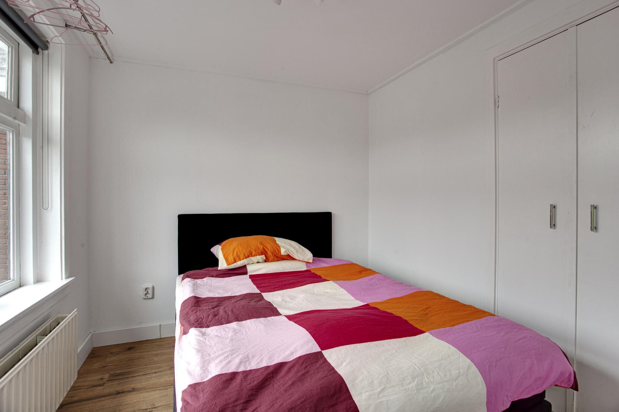 De overloop op de eerste verdieping biedt toegang tot twee slaapkamers, ontstaan door een praktische herindeling. Aan de voorzijde bevindt zich een ruime hoofdslaapkamer, aan de achterzijde een tweede, iets kleinere slaapkamer. Een vaste trap leidt naar de tweede verdieping.