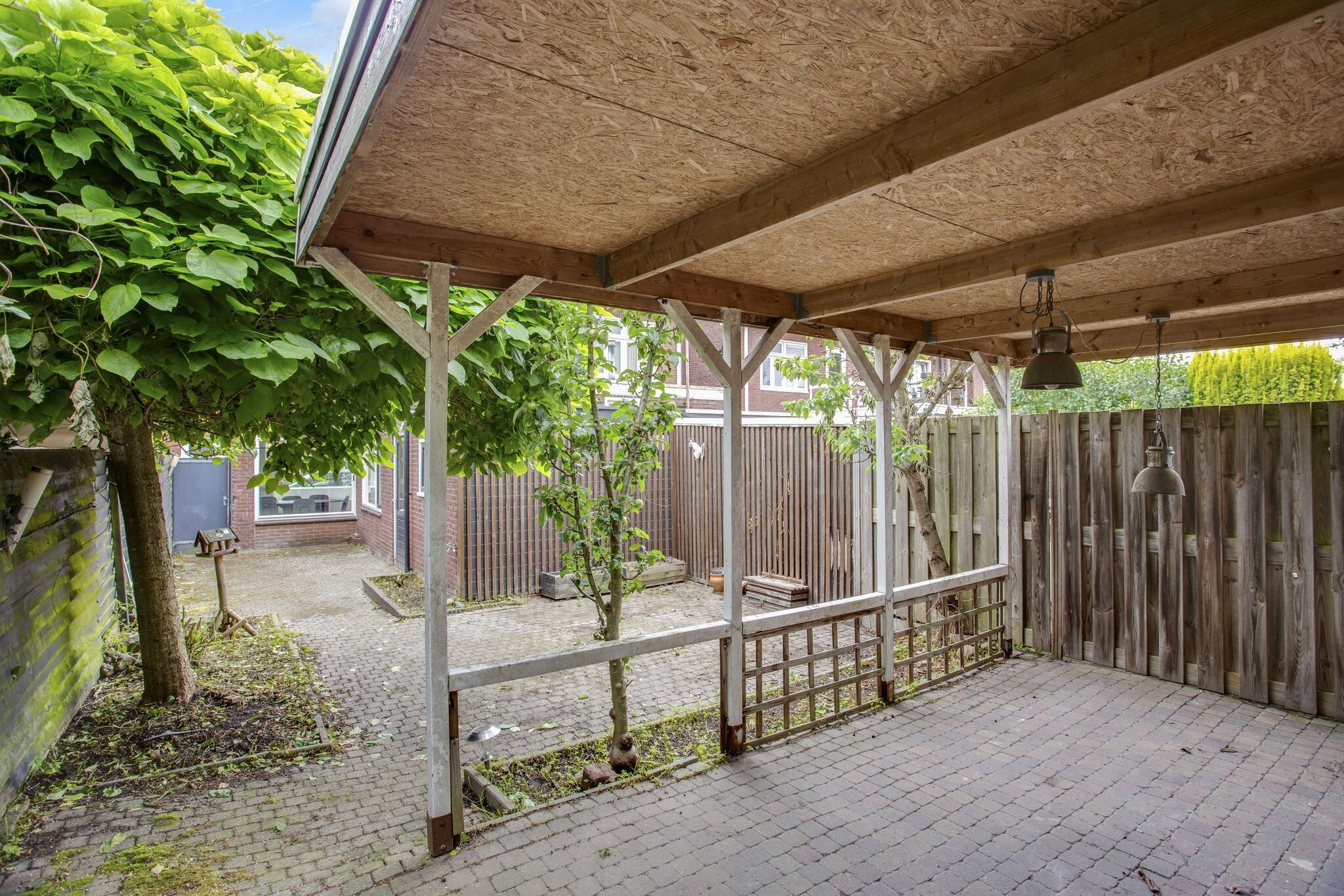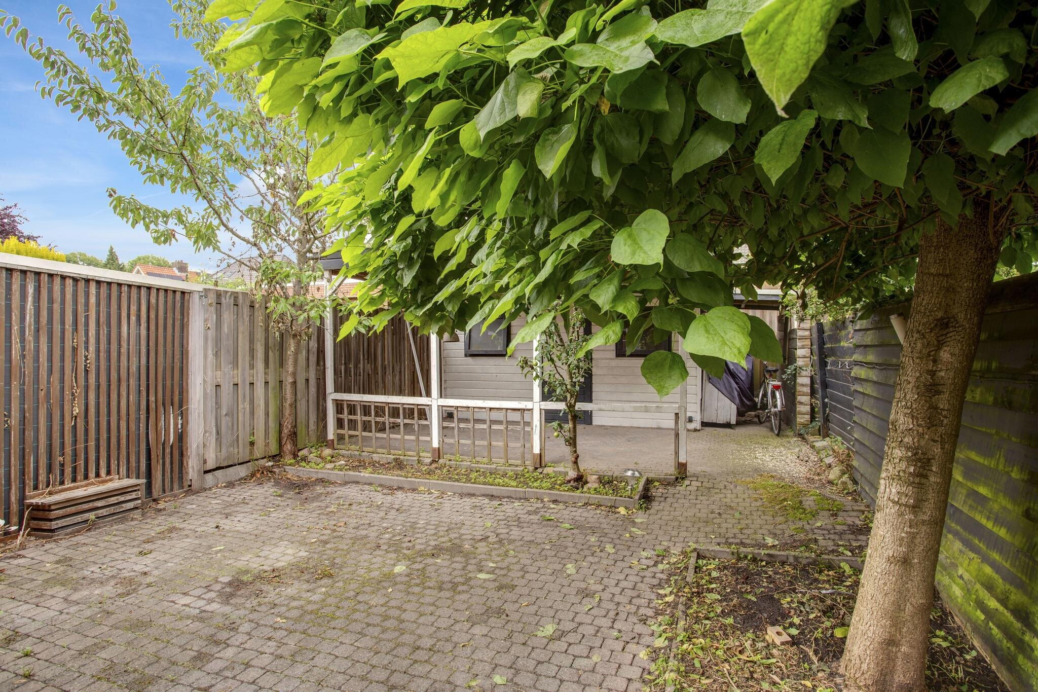 De woning beschikt niet over een voortuin, waardoor de volledige perceeloppervlakte van circa 150 m² zich achter de woning bevindt. Dit resulteert in een fijne, beschutte achtertuin op het noordoosten. De tuin is deels voorzien van groene borders, maar grotendeels bestraat, wat zorgt voor veel gebruiksgemak en ruimte voor een comfortabele tuinset of loungehoek. Achter op het perceel staat een ruime schuur, ideaal voor opslag of hobbymatig gebruik. Aangrenzend is een overdekt terras gerealiseerd, waar u beschut en sfeervol kunt genieten van het buitenleven. Een poort met naastgelegen gang zorgt ten slotte voor een praktische en directe ontsluiting naar de openbare weg.